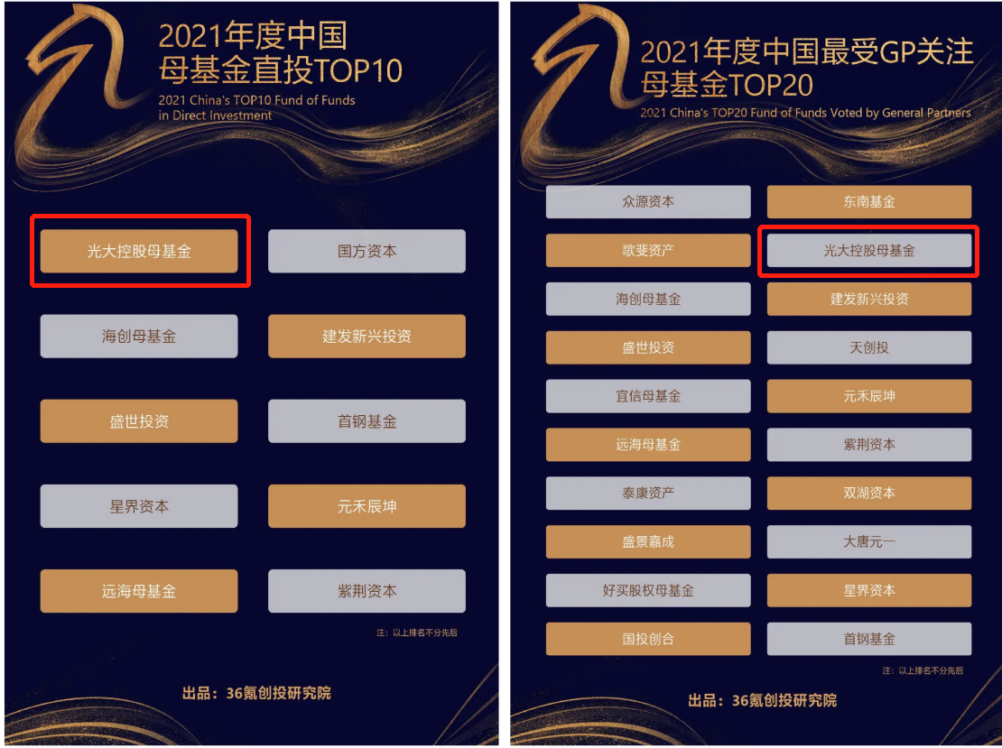 5月11日,36氪重磅發(fā)布中國最受LP認(rèn)可白馬、黑馬投資機構(gòu)暨最受GP關(guān)注母基金榜單。光大控股母基金憑借優(yōu)異的表現(xiàn)榮獲「2021年度中國母基金直投TOP10」、「2021年度中國最受GP關(guān)注母基金TOP20」二項大獎。