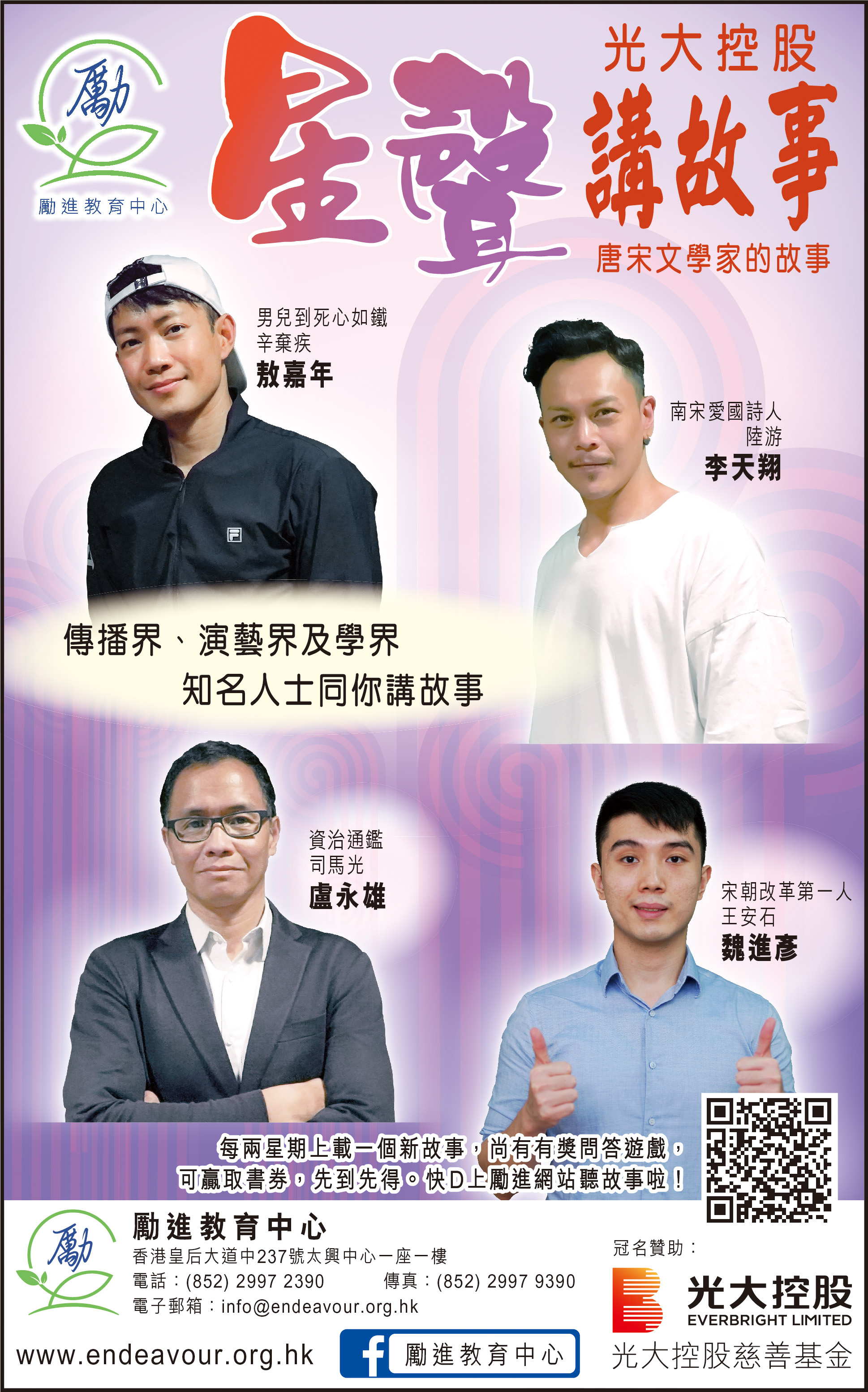 The "Peaceful Retirement" Scheme was launched and sponsored by Everbright and Endeavour Education Centre in 2016. Representatives across industries including education, academia and performing arts are invited to regularly record podcasts for Hong Kong primary and secondary school students on a series of Chinese history stories in a casual and lively way. The podcasts are broadcast on the internet. These stories will be developed into audiobooks and sent to primary and secondary schools in Hong Kong to encourage students to deepen their knowledge and understanding of Chinese history and culture.