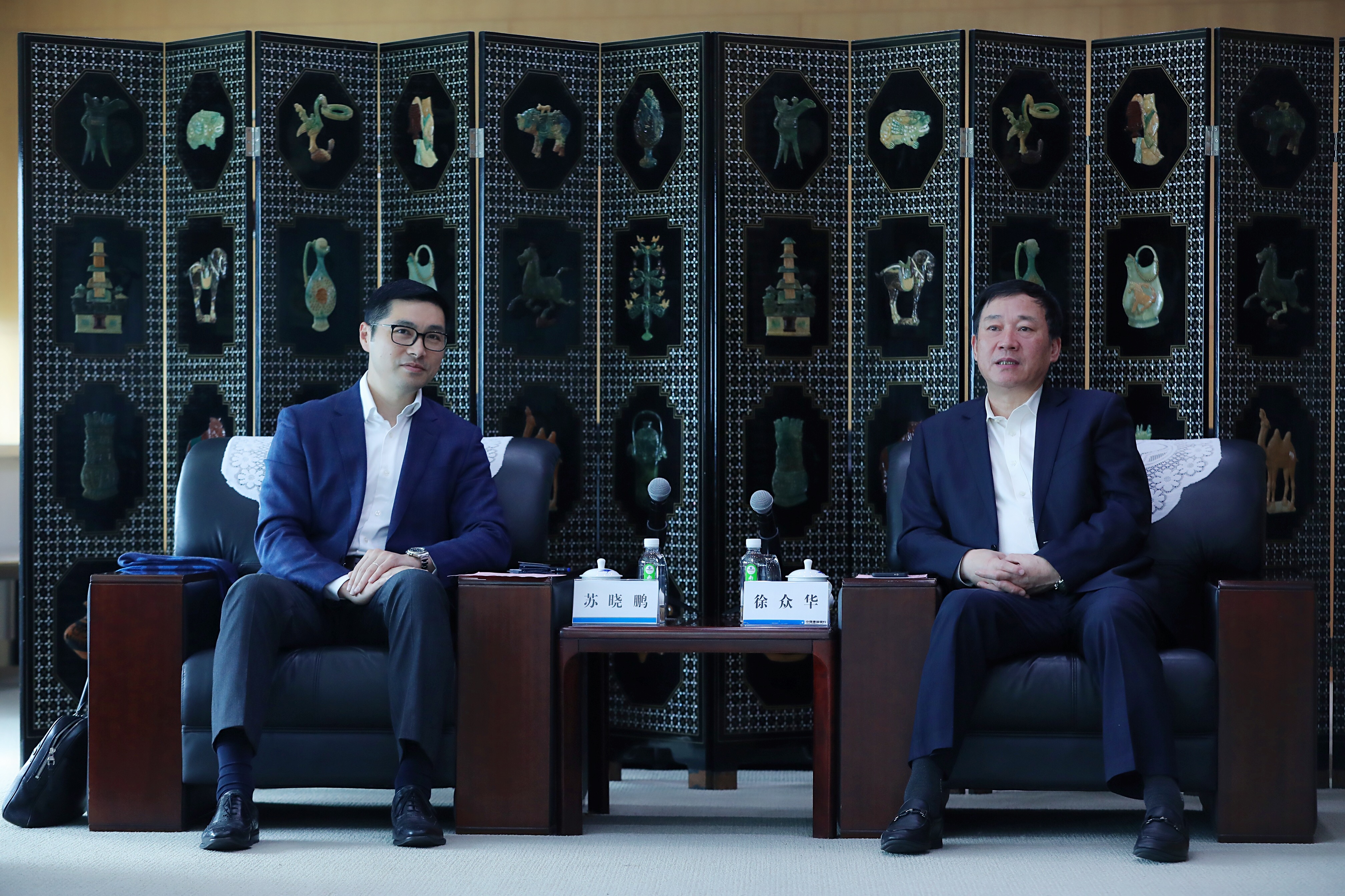 Kevin So, Chief Strategy Officer of Everbright, and Xu Zhonghua, Deputy President of CCB Shanghai, have a business meeting before the agreement signing ceremony