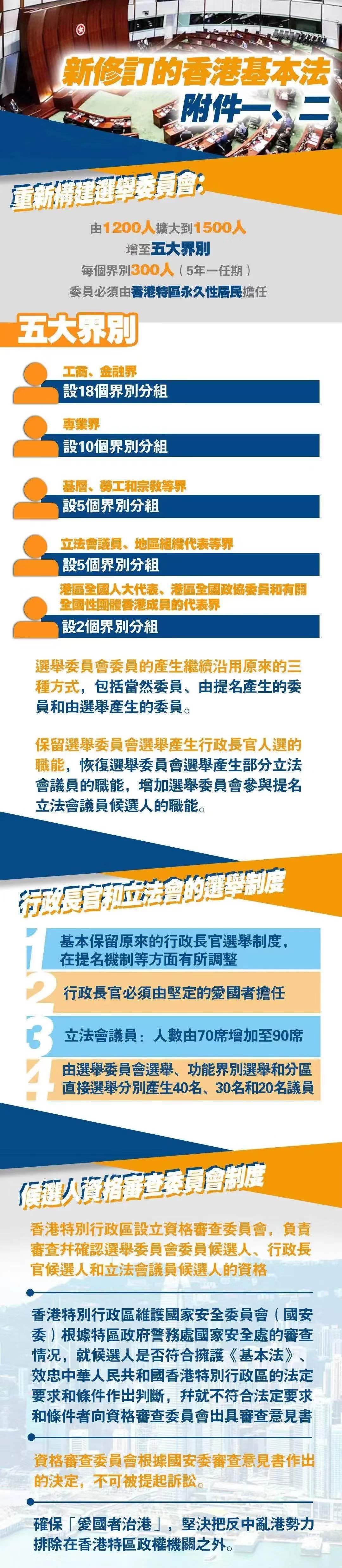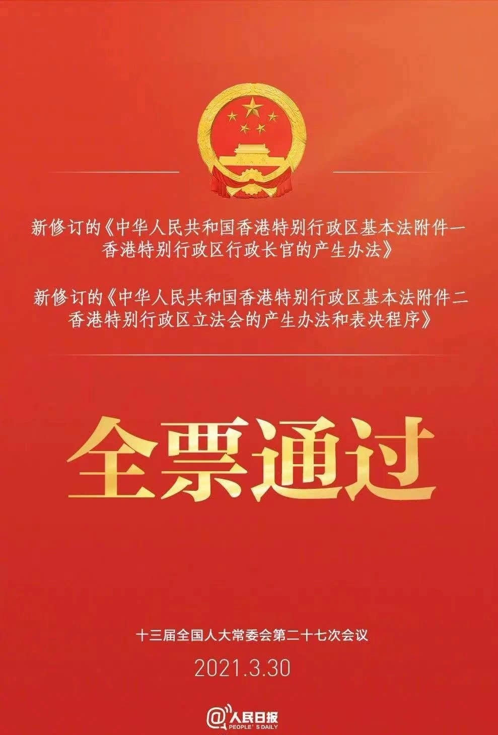 會議經(jīng)表決,全票通過新修訂的《中華人民共和國香港特別行政區(qū)基本法附件一香港特別行政區(qū)行政長官的產(chǎn)生辦法》、新修訂的《中華人民共和國香港特別行政區(qū)基本法附件二香港特別行政區(qū)立法會的產(chǎn)生辦法和表決程序》。國家主席習(xí)近平分別簽署第75、76號主席令予以公佈。