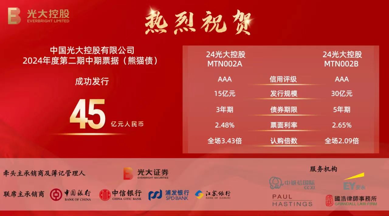 2024年5月13日,光大控股(股份代號:165.HK)2024年度第二期中期票據(jù)在中國銀行間市場成功發(fā)行,發(fā)行規(guī)模45億元人民幣,創(chuàng)近5年以來熊貓中票單期發(fā)行規(guī)模新高。本次發(fā)行兩個(gè)品種,品種一為3年期中期票據(jù),發(fā)行規(guī)模15億元人民幣,票面利率2.48%,創(chuàng)光大控股歷史債券發(fā)行票面利率新低;品種二為5年期中期票據(jù),發(fā)行規(guī)模30億元人民幣,票面利率2.65%,創(chuàng)有史以來同期限熊貓中票票面利率新低。