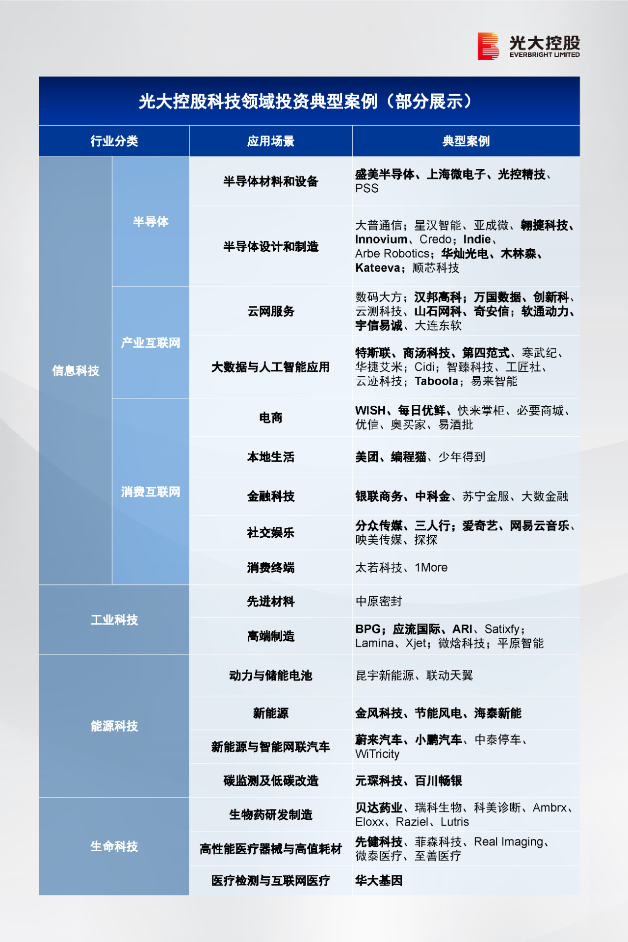 在投資賽道上,光大控股投資了半導體、產(chǎn)業(yè)互聯(lián)網(wǎng)、消費互聯(lián)網(wǎng)、海外製造、航空航天、醫(yī)療科技、新能源新材料、碳中和等十幾個領(lǐng)域,行業(yè)明星企業(yè)燦若星辰,新科技領(lǐng)域涉獵之廣,行業(yè)頭部企業(yè)之多,科技領(lǐng)域跨境投資和全球頂級投資機構(gòu)強強合作,在整個中國PE界少有。