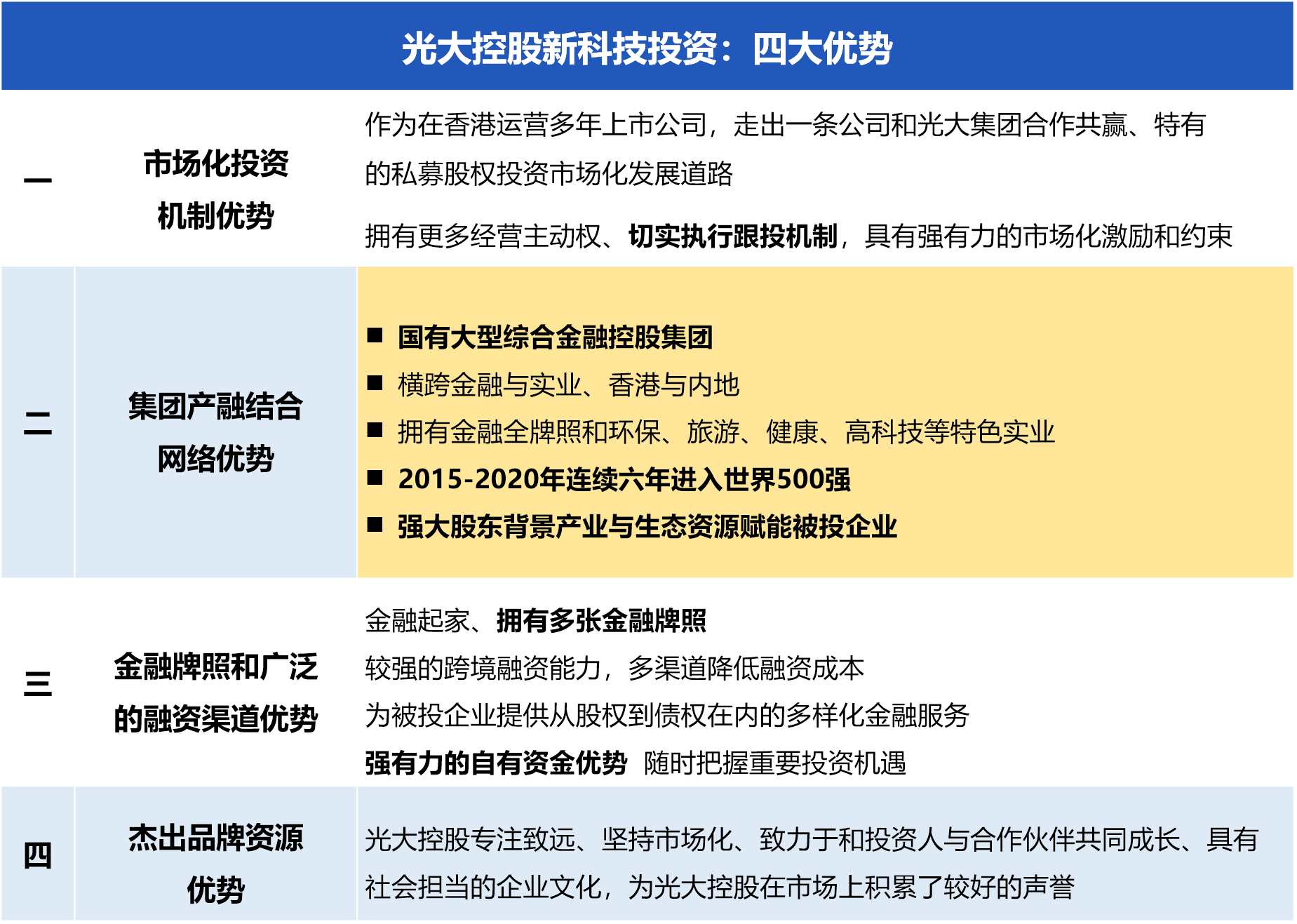 第二,在集團產(chǎn)融結(jié)合網(wǎng)路優(yōu)勢上。母公司光大集團作為國有大型綜合金融控股集團,橫跨金融與實業(yè)、香港與內(nèi)地,擁有金融全牌照和環(huán)保、旅遊、健康、高科技等特色實業(yè),2015-2020年連續(xù)六年進入世界500強。強大的母公司實力將為光大控股在科技領(lǐng)域投資提供頂級後盾,也為光大控股的科技項目提供豐富的產(chǎn)業(yè)孵化場景。