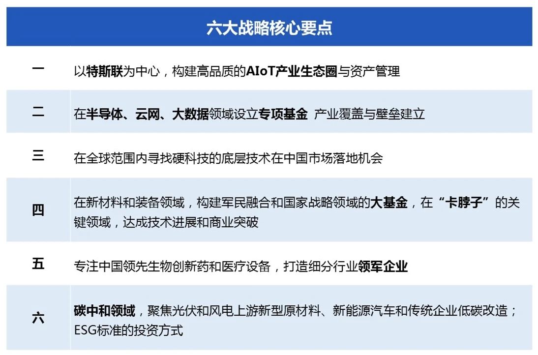 展望未來,光大控股持續(xù)看好科技在世界經(jīng)濟和社會變遷的關(guān)鍵性作用,將沿著科技的長坡、厚雪,持續(xù)加碼。積極圍繞雙循環(huán)和可持續(xù)發(fā)展兩條時代主線,以特斯聯(lián)為中心,構(gòu)建高品質(zhì)的AIoT產(chǎn)業(yè)生態(tài)圈與資產(chǎn)管理;在半導體、雲(yún)網(wǎng)、大數(shù)據(jù)領(lǐng)域設(shè)立專項基金,覆蓋產(chǎn)業(yè)並建立壁壘;在全球範圍內(nèi),尋找硬科技底層技術(shù)在中國市場的落地機會;在新材料和裝備領(lǐng)域,構(gòu)建軍民融合和國家戰(zhàn)略領(lǐng)域的大基金,在‘卡脖子’的關(guān)鍵領(lǐng)域,達成技術(shù)進展和商業(yè)突破;在醫(yī)療領(lǐng)域,專注中國領(lǐng)先生物創(chuàng)新藥和醫(yī)療設(shè)備,打造細分行業(yè)的領(lǐng)軍企業(yè);在碳中和領(lǐng)域,聚焦光伏和風電上游新型原材料、新能源汽車和傳統(tǒng)企業(yè)低碳改造;探索ESG標準的投資方式。構(gòu)建大國科技戰(zhàn)略崛起下,光大控股的跨境科技投資戰(zhàn)略。