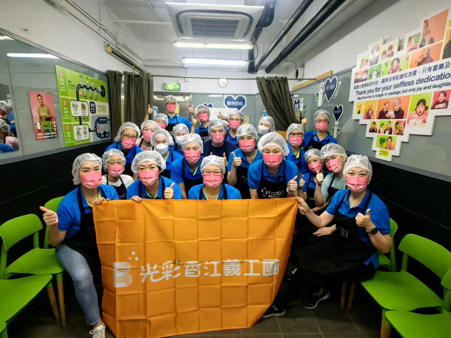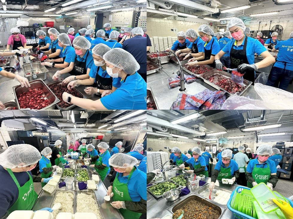 在聽(tīng)取了有關(guān)現(xiàn)時(shí)食物浪費(fèi)問(wèn)題及惜食堂的運(yùn)作的講解後,第一組光大義工來(lái)到惜食堂廚房,分成兩隊(duì)開(kāi)始流水式作業(yè)。大家分工協(xié)作,在兩個(gè)多小時(shí)的時(shí)間裡,依序完成生食材處理、準(zhǔn)備飯盒、盛飯裝菜等系列工作,製作了兩千餘個(gè)盒飯,由惜食堂分批送到全港各區(qū)需要食物支援的人士。