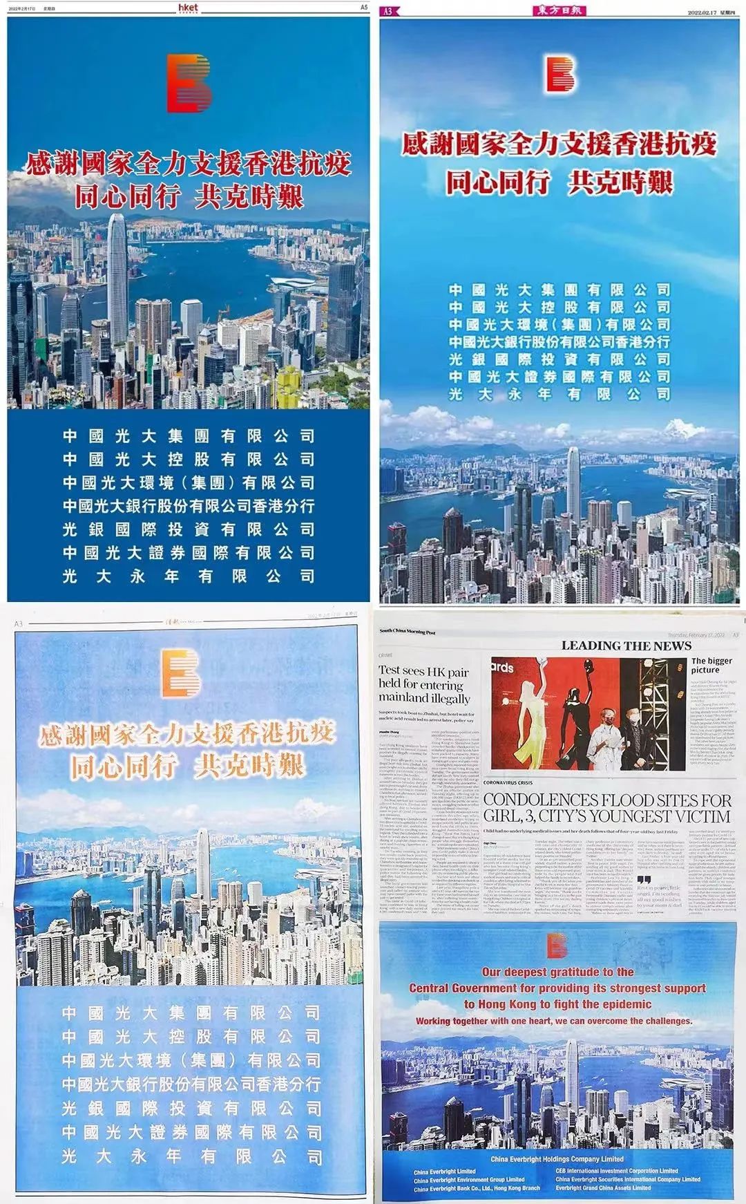 香港第五波疫情牽動全國上下的心。在抗疫的重要時刻,習近平總書記心系香港同胞安危,作出重要指示,為香港注入了強大正能量。光大控股積極響應,與光大集團駐港企業(yè)在四大報紙(《經(jīng)濟日報》、《東方日報》、《信報》、《南華早報》)聯(lián)合刊登抗疫公益廣告,表達同心抗疫、共克時艱的決心。
