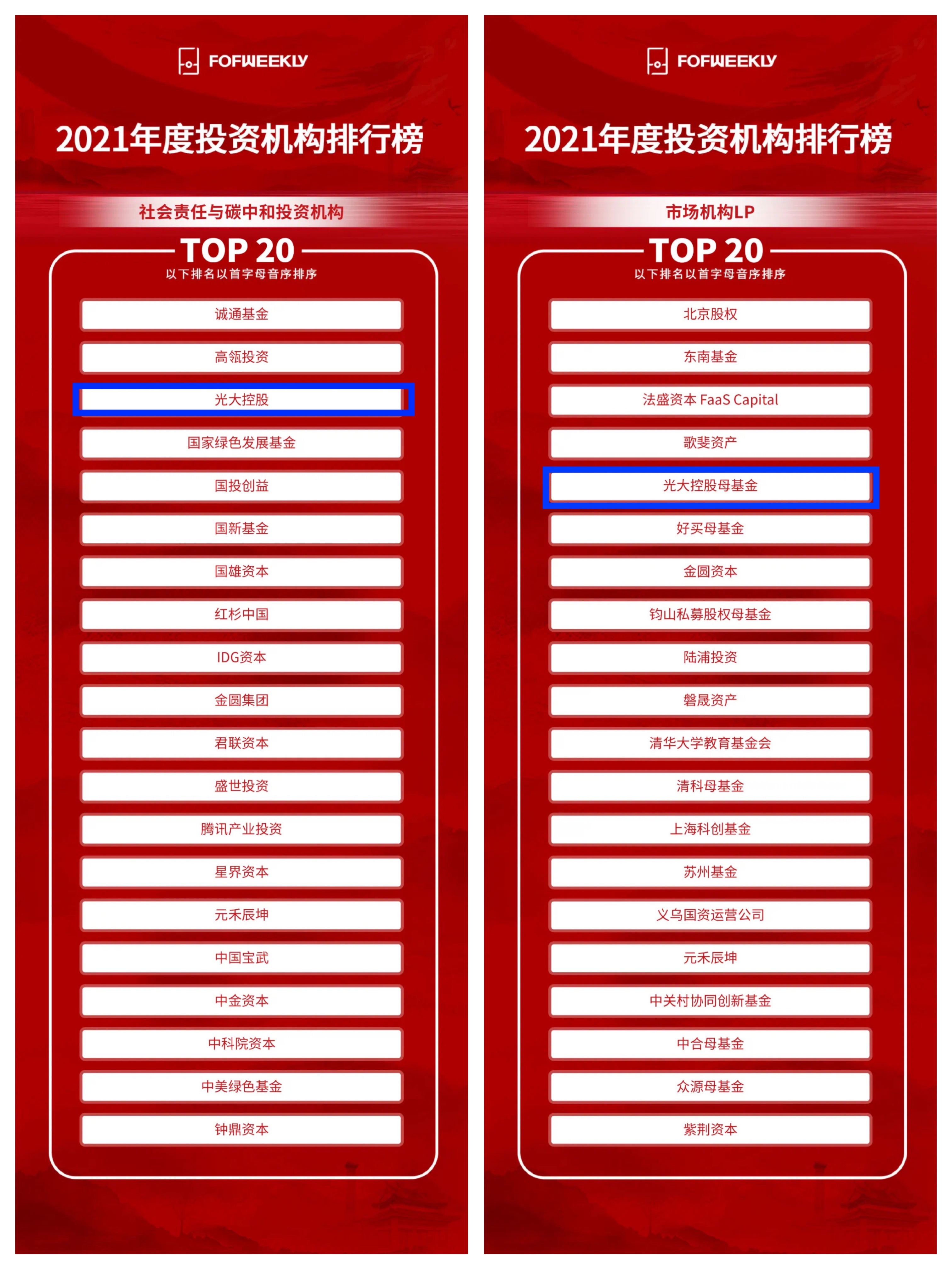 3月18日,F(xiàn)OFWEEKLY重磅發(fā)佈「2021年度投資機構(gòu)排行榜」,光大控股憑藉在「雙碳」領(lǐng)域的扎實工作和優(yōu)異表現(xiàn),榮登「社會責(zé)任與碳中和投資機構(gòu)TOP 20」榜單,光大控股母基金憑藉強大的資金和投資實力,榮登「市場機構(gòu)LP TOP 20」榜單。