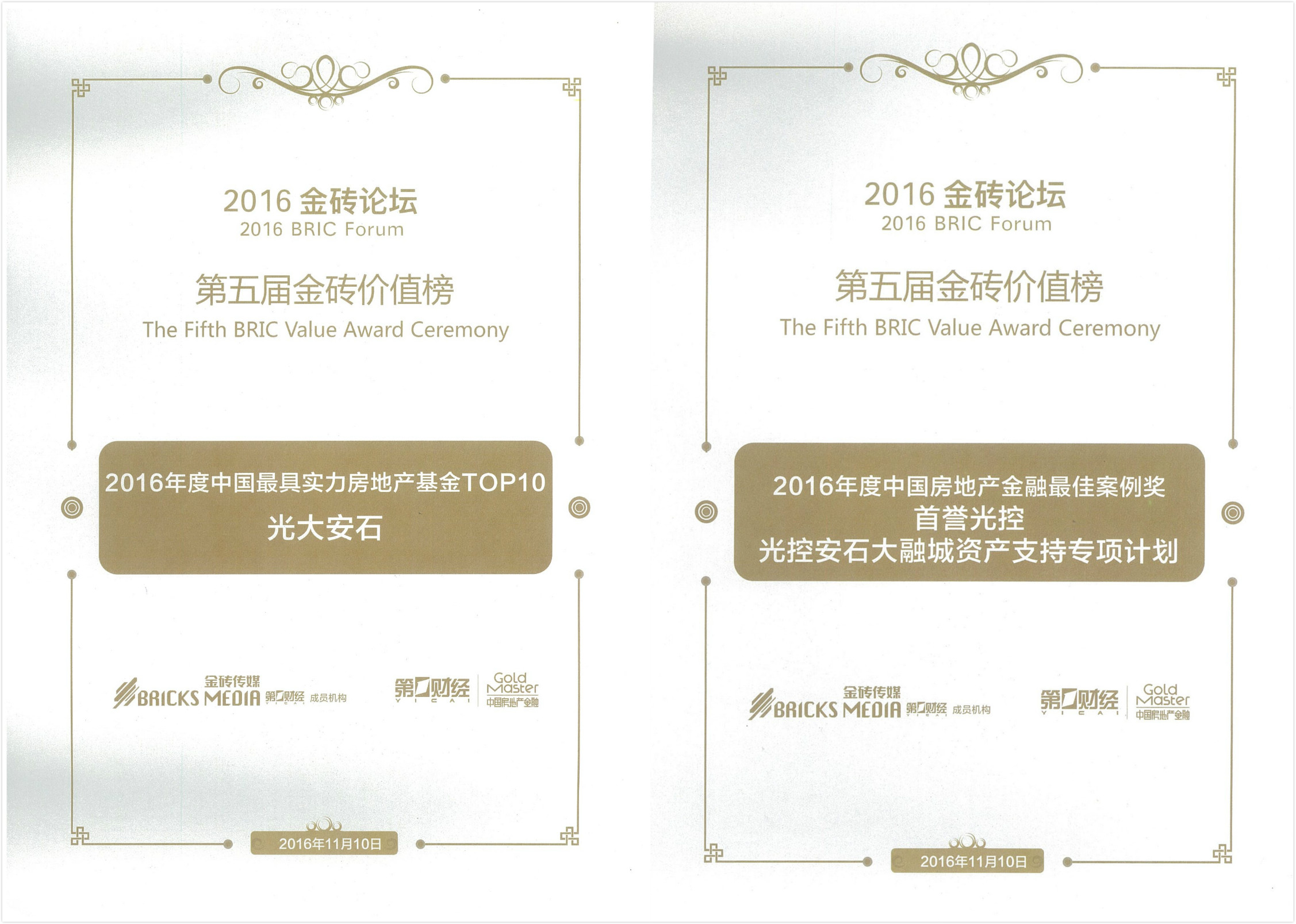 光大控股旗下光大安石榮獲金磚價值榜 “2016年度中國最具實力房地產(chǎn)基金TOP10”